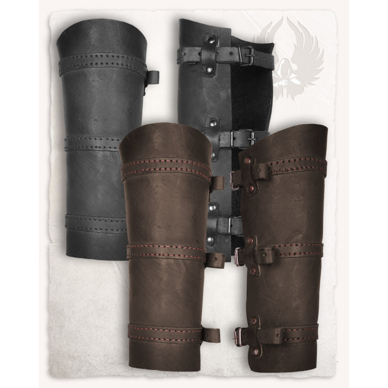 Ett par enkla läderbenskenor. De tre remmarna de stängs med är fastsydda runt hela ytan. De passar för olika kostymidéer.