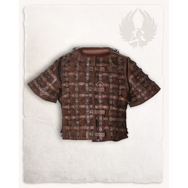 Denna läderrustning är helsnygg. Den stängs med spännen framtill och kan justeras med läderremmar på sidorna. På så sätt kan du enkelt justera den efter din kropp senare. Ringarna fästs i ett fyrkantigt mönster med hjälp av läderremmar. Du kan bära jackan ensam, i kombination med en gambeson- eller ringbrynjeskjorta eller lägga till matchande lårskydd för att få en imponerande kroppsrustning.