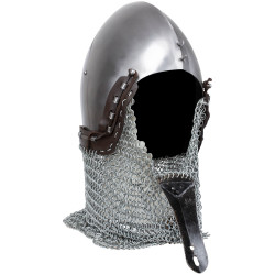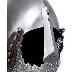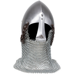 Alwin-bascineten med ringbrynja med aventil är baserad på en europeisk hjälmtyp från 1300-talet. Den bars av riddare och soldater under senmedeltiden och räknas bland de klassiska hjälmformerna från perioden. Den djupt dragna, spetsiga hjälmkoppen erbjuder ett solidt skydd runtom för huvud, nacke och axlar – särskilt i kombination med den fastmonterade ringbrynjan. En anmärkningsvärd egenskap hos denna modell är den avtagbara nässtången, som ger extra ansiktsskydd vid behov och kan monteras eller tas bort med bara några få steg – perfekt för variation eller praktisk användning. Insidan har ett fast skumfoder för komfort, och en helt justerbar hakrem garanterar en säker passform.