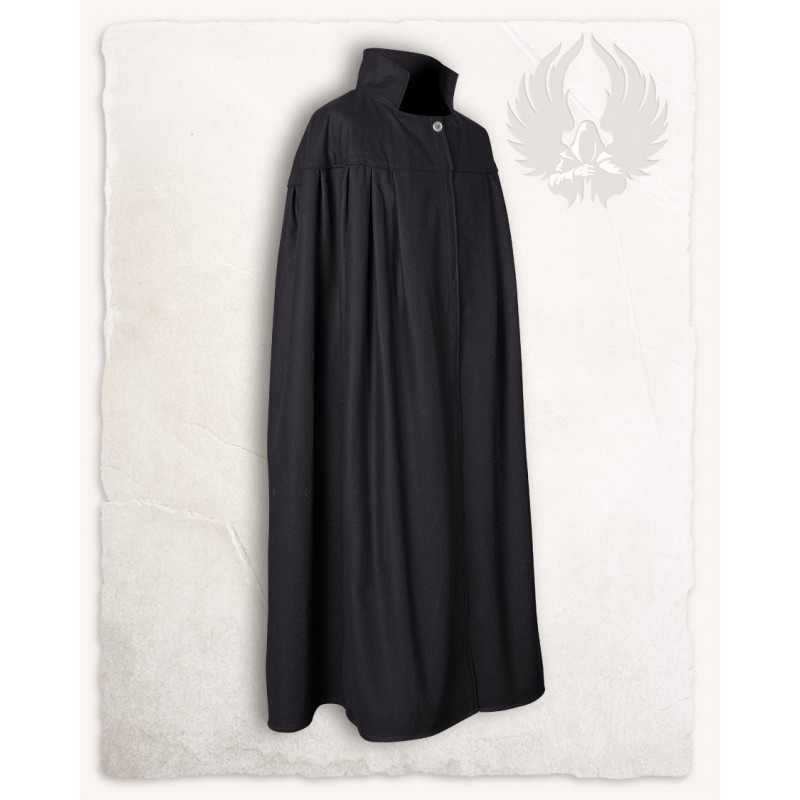 Stängs med en knapp i halsen. Slitsar i sidorna för att kunna sticka ut armarna.