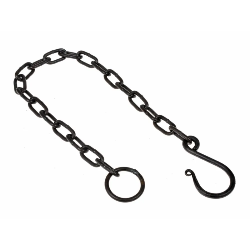 Den medeltida grimkedjan har en liten krok på ena sidan som enkelt hakas fast i kittelns handtag eller i en länk i kedjan så att kittelns höjd över elden enkelt kan justeras.