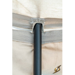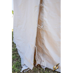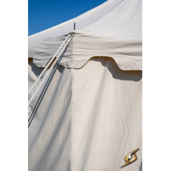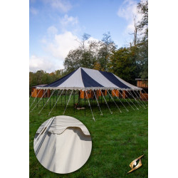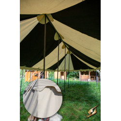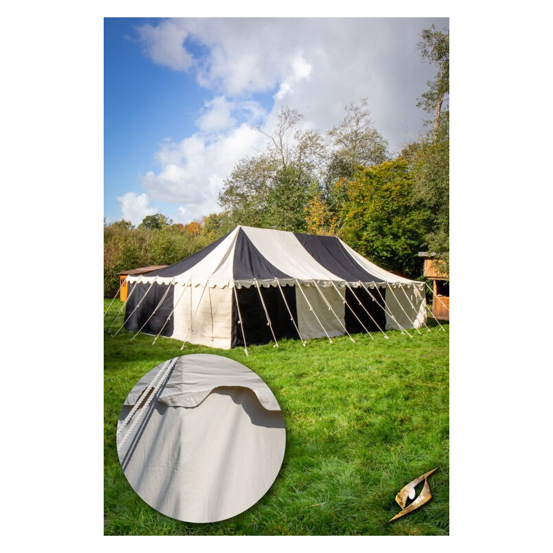 Taket och väggarna stöds av stänger, vilket möjliggör en öppen baldakin utan väggar eller en avskild uppställning med väggar. Som en uppgradering från den typiska designen med tråkiga repringar fästs väggdelarna i Epic Armoury Marquee-tältet enkelt på takdelen med fästkrokar. Vi har tillverkat stängerna av pulverlackerat järn medan tyget består av 100 % kraftig (425 g/m²) bomull, väderbeständig med paraffinvax för extra hållbarhet.