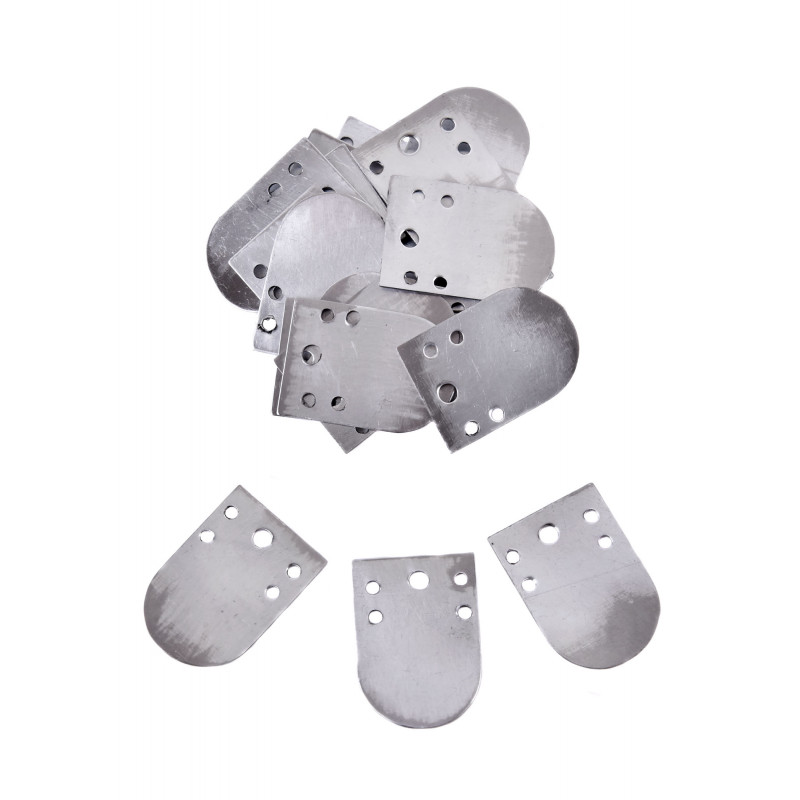 Plattorna är tillverkade av ca 22 gauge stål och utrustade med 5 förborrade hål, det större gör att du kan knyta, sy eller nita fast dem på ett bakstycke, och de mindre på sidorna gör att plattorna kan fästas ihop för stabilitet.